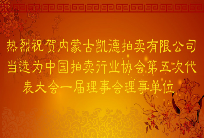 熱烈祝賀內(nèi)蒙古凱德拍賣有限公司當(dāng)選為中國(guó)拍賣行業(yè)協(xié)會(huì)第五次代表大會(huì)一屆理事會(huì)理事單位