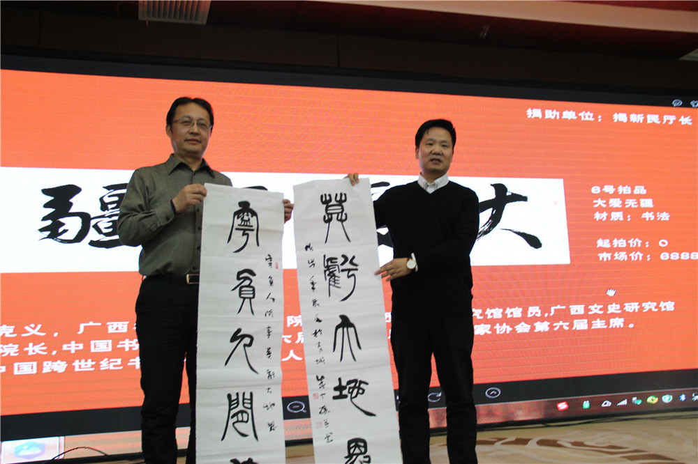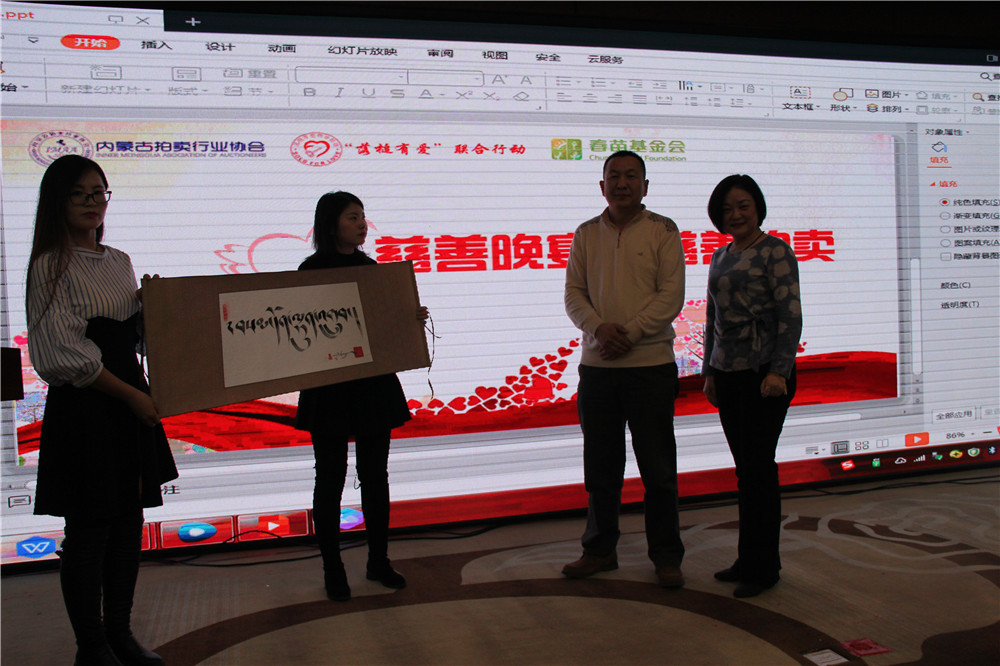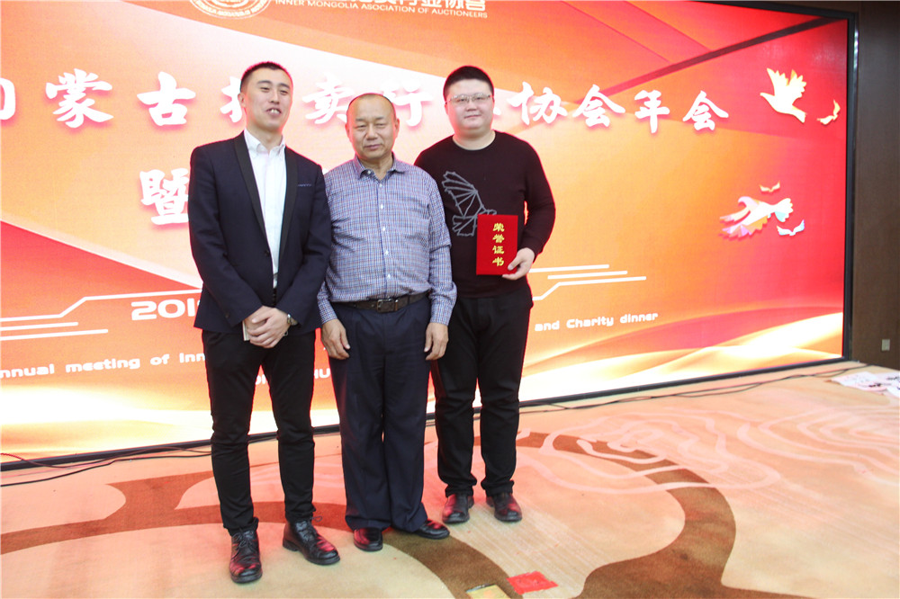 內(nèi)蒙古拍賣行業(yè)協(xié)會王志江會長與與拍賣師于闖及 捐贈愛心人士  內(nèi)蒙古拍賣行業(yè)協(xié)會娜晴秘書長與拍賣師于闖